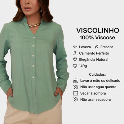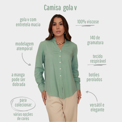 Camisa em viscolinho leve e fresco, com gola V que valoriza o colo e traz um toque de sofisticação natural. Confeccionada em cores em alta da temporada, é uma peça versátil e elegante, perfeita para compor looks do dia a dia, do trabalho ou de momentos casuais com estilo. O viscolinho garante conforto, caimento fluido e um visual sempre impecável.