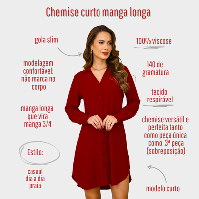 Nosso chemise curto manga longa é perfeito para quem busca praticidade. Feito em tecido leve e fresco, ele traz caimento solto e confortável, ideal para dias quentes ou momentos casuais. O design clássico com botões frontais e mangas longas permite diferentes formas de uso — aberto como sobreposição ou fechado como vestido e até mesmo como saída de praia. Versátil e atemporal, é aquela peça que te acompanha do passeio ao fim de tarde.