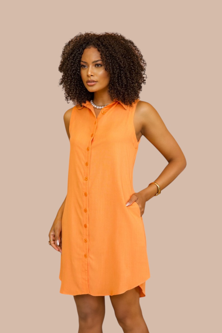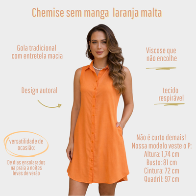 Nossa chemise sem mangas feita em viscolinho é a peça ideal para dias quentes. O viscolinho é um tecido leve e respirável, composto de viscose com aparência de linho, porém proporcionando frescor e conforto. A chemise tem um corte solto e fluido, caindo suavemente sobre o corpo. O design sem mangas permite maior liberdade de movimento e ventilação, enquanto a gola clássica e a abertura frontal com botões adicionam um toque elegante e versátil. Com bolsos laterais e entretelada, é ideal para um look casual e sofisticado em dias de calor.