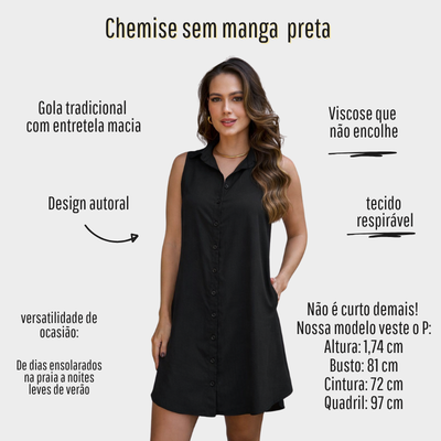 Uma chemise sem mangas feita em viscolinho é a peça ideal para dias quentes. O viscolinho é um tecido leve e respirável, composto de viscose com aparência de linho, porém proporcionando frescor e conforto. A chemise tem um corte solto e fluido, caindo suavemente sobre o corpo. O design sem mangas permite maior liberdade de movimento e ventilação, enquanto a gola clássica e a abertura frontal com botões adicionam um toque elegante e versátil. Com bolsos laterais e entretelada, é ideal para um look casual e sofisticado em dias de calor.