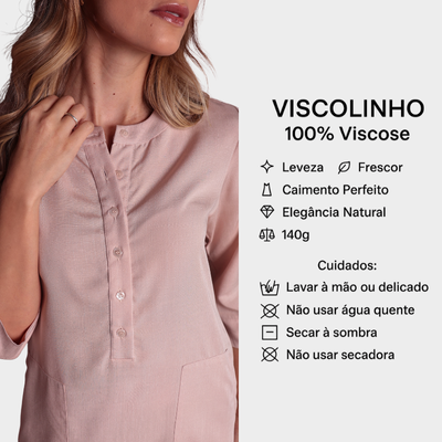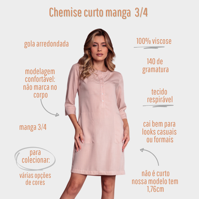 Nossa chemise fechada com manga 3/4 e bolsos frontais é a união ideal entre funcionalidade e sofisticação. Com modelagem reta e caimento fluido, ela valoriza a silhueta de forma natural e elegante. As mangas 3/4 trazem leveza e versatilidade, enquanto os bolsos discretos e bem posicionados adicionam charme e praticidade ao look — perfeitos para quem valoriza detalhes com propósito.