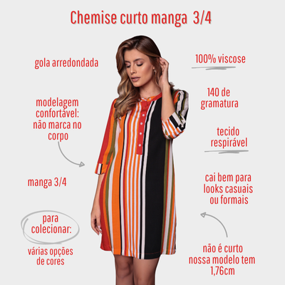 Nossa chemise fechada com manga 3/4 e bolsos frontais é a união ideal entre funcionalidade e sofisticação. Com modelagem reta e caimento fluido, ela valoriza a silhueta de forma natural e elegante. As mangas 3/4 trazem leveza e versatilidade, enquanto os bolsos discretos e bem posicionados adicionam charme e praticidade ao look — perfeitos para quem valoriza detalhes com propósito.