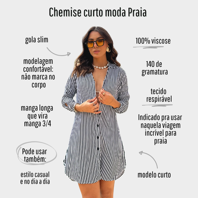 A manga com opção de dobra adiciona um toque moderno e prático, permitindo diferentes formas de uso conforme a ocasião. Versátil e elegante, o chemise transita facilmente da praia ao dia a dia, podendo ser usado como saída de praia ou como vestido leve com sandálias ou rasteirinhas.