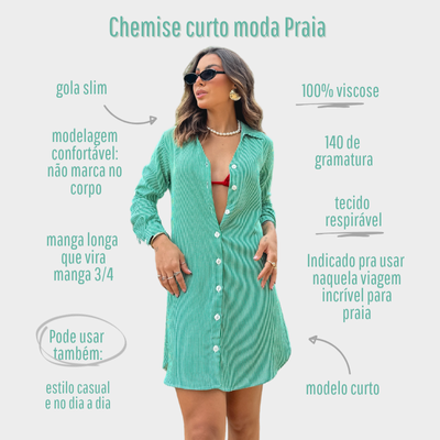 A manga com opção de dobra adiciona um toque moderno e prático, permitindo diferentes formas de uso conforme a ocasião. Versátil e elegante, o chemise transita facilmente da praia ao dia a dia, podendo ser usado como saída de praia ou como vestido leve com sandálias ou rasteirinhas.