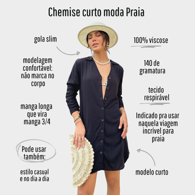 A manga com opção de dobra adiciona um toque moderno e prático, permitindo diferentes formas de uso conforme a ocasião. Versátil e elegante, o chemise transita facilmente da praia ao dia a dia, podendo ser usado como saída de praia ou como vestido leve com sandálias ou rasteirinhas.