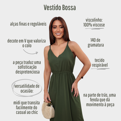 Com leveza e charme na medida certa, o Vestido midi Bossa é perfeito para quem busca um visual descomplicado, mas com personalidade. Com estampas exclusivas traz movimento e brasilidade à peça, enquanto o decote em V e a cintura marcada valorizam a silhueta com delicadeza. O comprimento midi e o caimento suave fazem dele o companheiro ideal para almoços especiais, jantares à beira-mar ou momentos de lazer com estilo. Um vestido leve, versátil e com alma como a mulher que o veste.