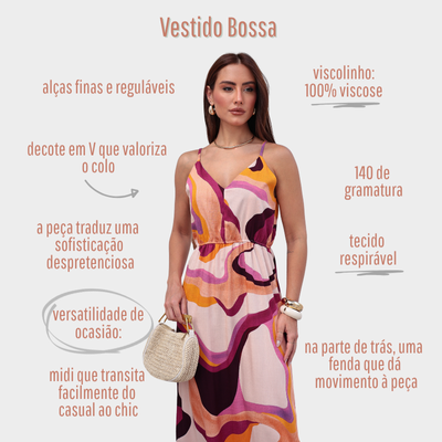 Com leveza e charme na medida certa, o Vestido midi Bossa é perfeito para quem busca um visual descomplicado, mas com personalidade. Com estampas exclusivas traz movimento e brasilidade à peça, enquanto o decote em V e a cintura marcada valorizam a silhueta com delicadeza. O comprimento midi e o caimento suave fazem dele o companheiro ideal para almoços especiais, jantares à beira-mar ou momentos de lazer com estilo. Um vestido leve, versátil e com alma como a mulher que o veste.