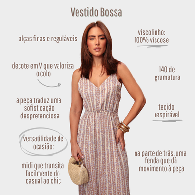 Com leveza e charme na medida certa, o Vestido midi Bossa é perfeito para quem busca um visual descomplicado, mas com personalidade. Com estampas exclusivas traz movimento e brasilidade à peça, enquanto o decote em V e a cintura marcada valorizam a silhueta com delicadeza. O comprimento midi e o caimento suave fazem dele o companheiro ideal para almoços especiais, jantares à beira-mar ou momentos de lazer com estilo. Um vestido leve, versátil e com alma como a mulher que o veste.