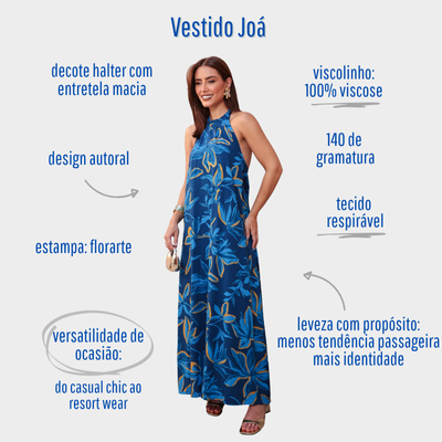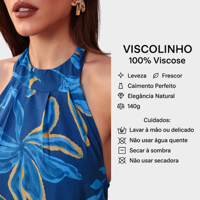 Com caimento fluido e decote halter que valoriza os ombros com delicadeza, ele une sofisticação e frescor em uma peça só.