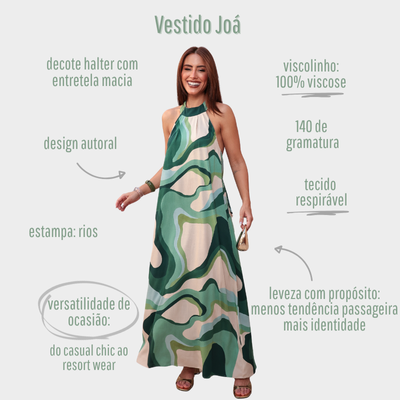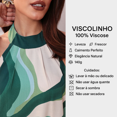 Com caimento fluido e decote halter que valoriza os ombros com delicadeza, ele une sofisticação e frescor em uma peça só.