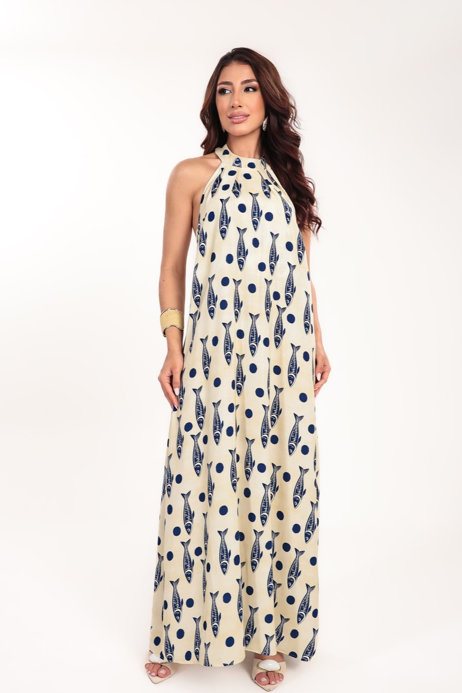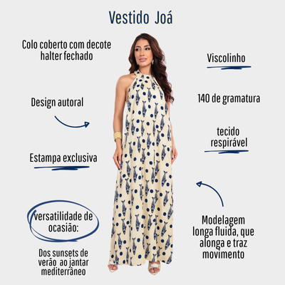 Com caimento fluido e decote halter que valoriza os ombros com delicadeza, ele une sofisticação e frescor em uma peça só.