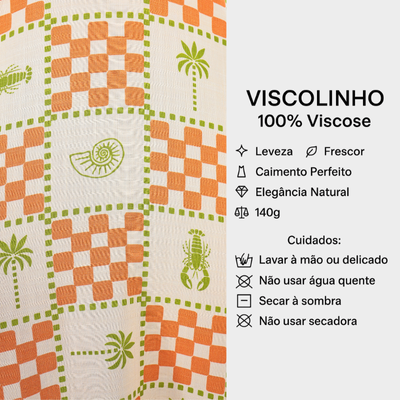 A estampa Tropical Chess tem um estilo cool, retrô e super verão e é formada por um quadriculado rústico em tons de laranja queimado e verde oliva, lembrando o efeito de tramas manuais. Entre os blocos xadrez, surgem ícones tropicais em verde — como coqueiros estilizados, ammonites (conchas em espiral) e lagostas, que reforçam o clima descontraído e litorâneo. O resultado é uma padronagem divertida, marcante e cheia de personalidade, perfeita para peças amplas e fluidas, pois o xadrez grande cria impacto visual sem pesar.