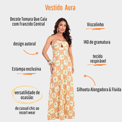 O Vestido Aura é aquele tomara que caia impecável que valoriza o colo e traz elegância instantânea. Com caimento leve e acabamento premium, ele entrega um visual moderno, feminino e perfeito para dias de verão e noites especiais. Um look que destaca a beleza natural e garante presença. Confeccionado em viscose é super fresco!