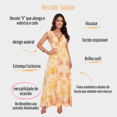 Solare é o vestido ideal para ocasiões especiais. O decote em V valoriza o colo com delicadeza, a cintura marcada alonga a silhueta e a saia fluida cria um movimento bonito e elegante. As alças largas trazem conforto e segurança, deixando você à vontade do começo ao fim. Zero amarrações, total praticidade.