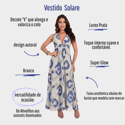 Solare é o vestido ideal para ocasiões especiais. O decote em V valoriza o colo com delicadeza, a cintura marcada alonga a silhueta e a saia fluida cria um movimento bonito e elegante. As alças largas trazem conforto e segurança, deixando você à vontade do começo ao fim. Zero amarrações, total praticidade.