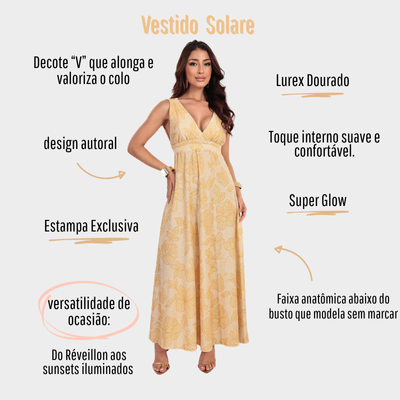 Solare é o vestido ideal para ocasiões especiais. O decote em V valoriza o colo com delicadeza, a cintura marcada alonga a silhueta e a saia fluida cria um movimento bonito e elegante. As alças largas trazem conforto e segurança, deixando você à vontade do começo ao fim. Zero amarrações, total praticidade.