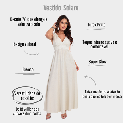 Solare é o vestido ideal para ocasiões especiais. O decote em V valoriza o colo com delicadeza, a cintura marcada alonga a silhueta e a saia fluida cria um movimento bonito e elegante. As alças largas trazem conforto e segurança, deixando você à vontade do começo ao fim. Zero amarrações, total praticidade.